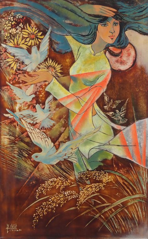 Vietnam, travail moderne, Panneau en laque, représentant une jeune femme entourée de colombes. Signé en bas à gauche Chanh Lê. 86. Dim. 80 x 50 cm