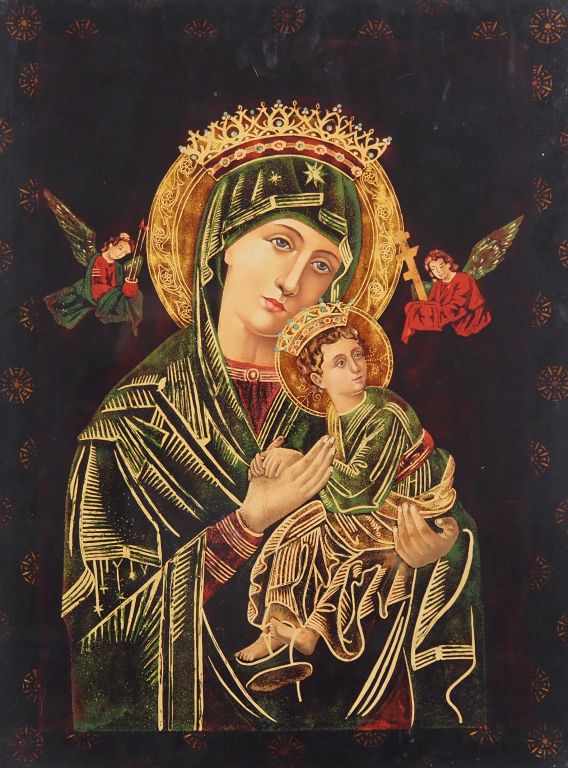Vietnam, travail moderne, Panneau en laque, représentant une vierge à l’enfant dans le goût des icônes byzantines. Dim. 80 x 60 cm