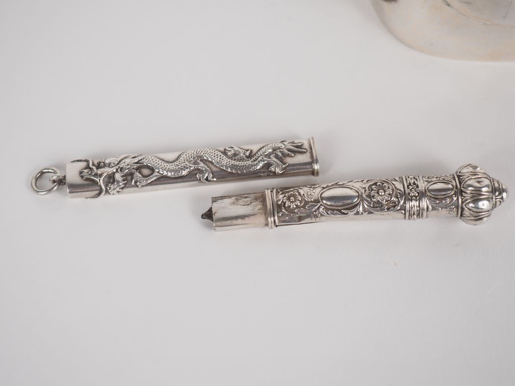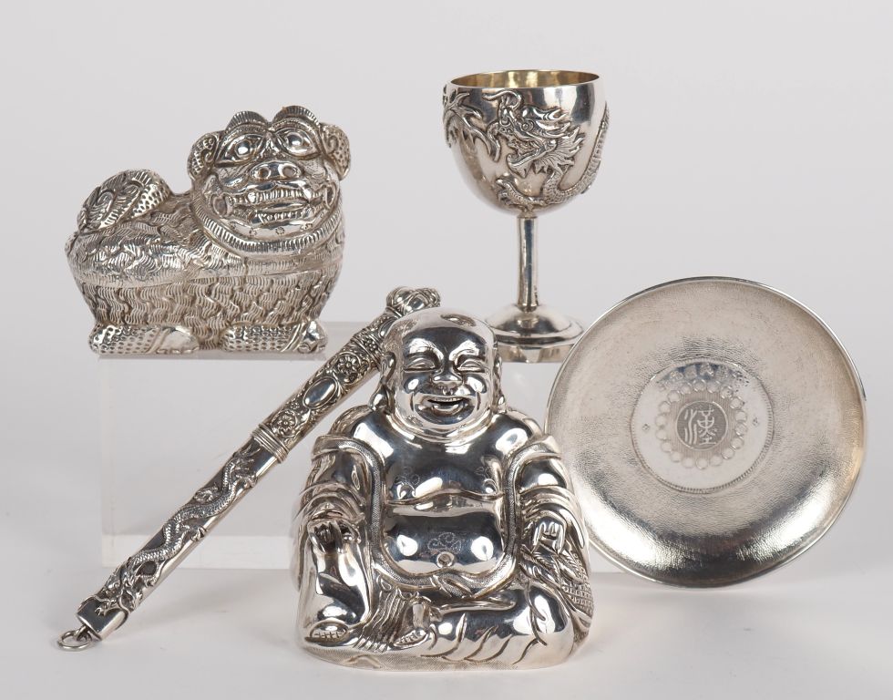 Vietnam, vers 1900 Ensemble de cinq éléments en argent comprenant, un petit sorbet, un bouddha milefo, un lion bouddhique, une petite coupe avec une monnaie, et un petit étui. H. 6,5 à 8 cm Poids. 270,39 g (enfoncements et accident sur l'étui)