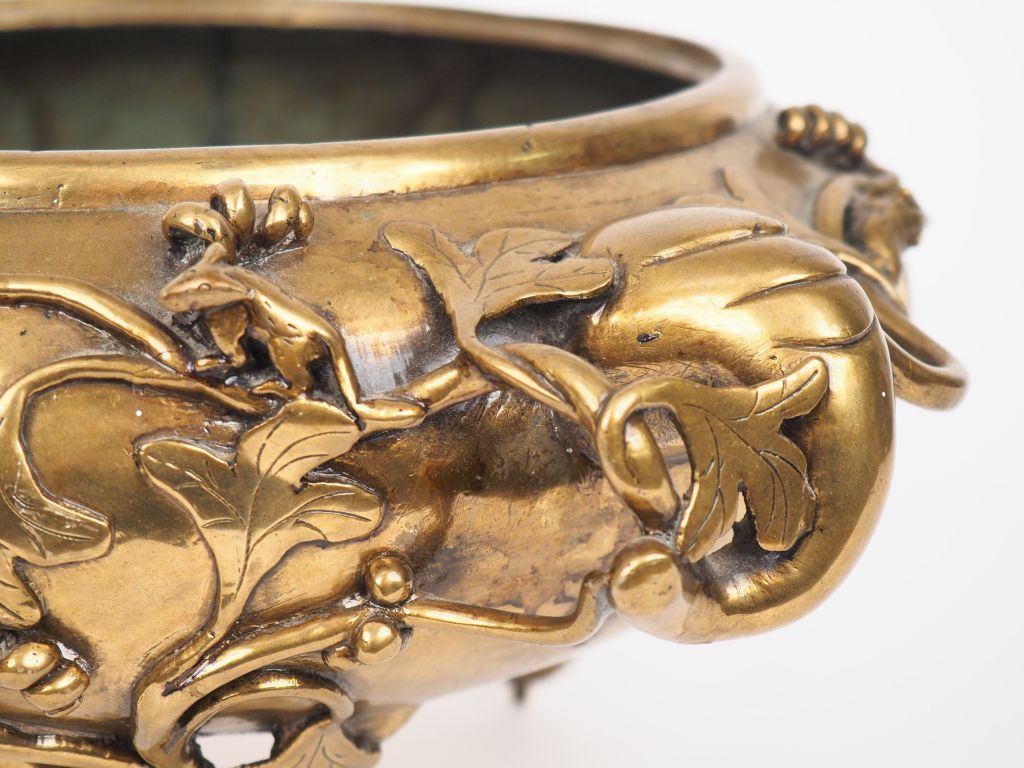 Vietnam, vers 1920 Brûle encens tripode en bronze doré à décor en relief de loirs évoluant sur des pampres de vignes. Des branches formants anses. Dim. 15 x 35 x 28 cm Manque le couvercle