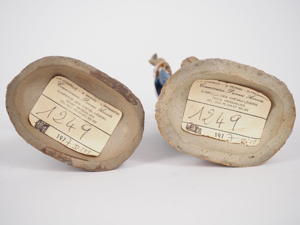Vietnam, vers 1920 Deux statuettes en céramique céladon, beige et bleu, représentant un couple de dignitaires. H. 21 cm (Manque un petit doigt de l’homme)