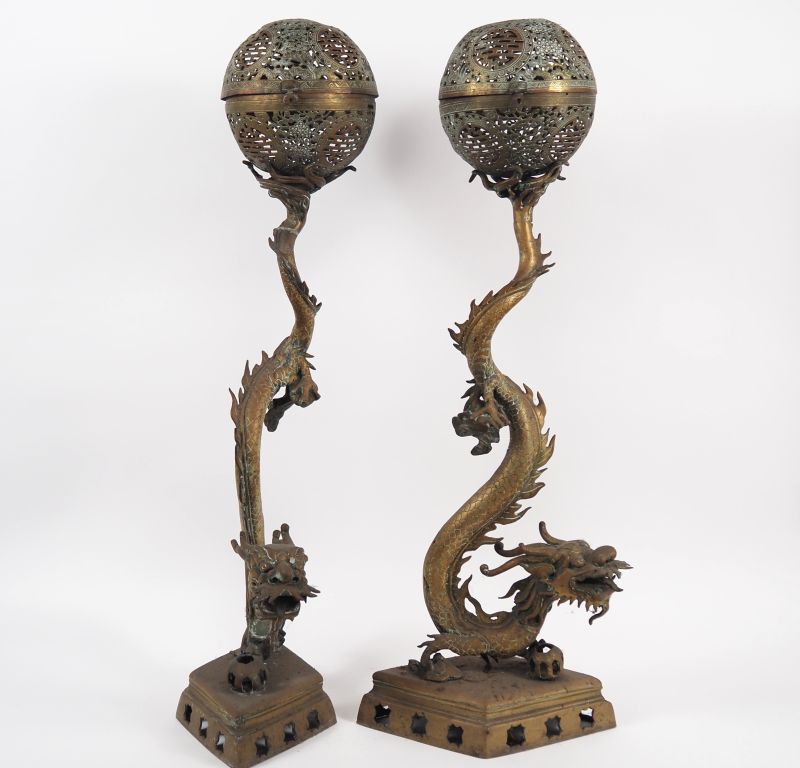 Vietnam, vers 1920 Paire de grands candélabres en cuivre de forme sphérique, reposant sur un piètement en forme de dragons, à décor des caractères shou, fleurs et prunus ajourés. H. 96 cm
