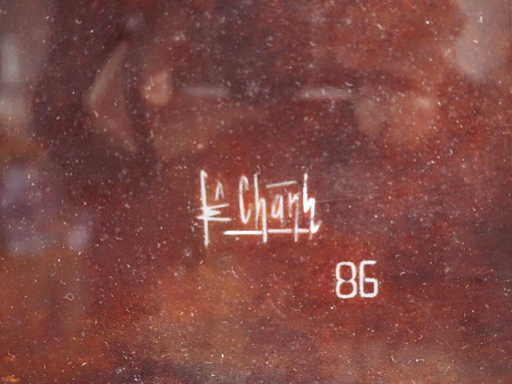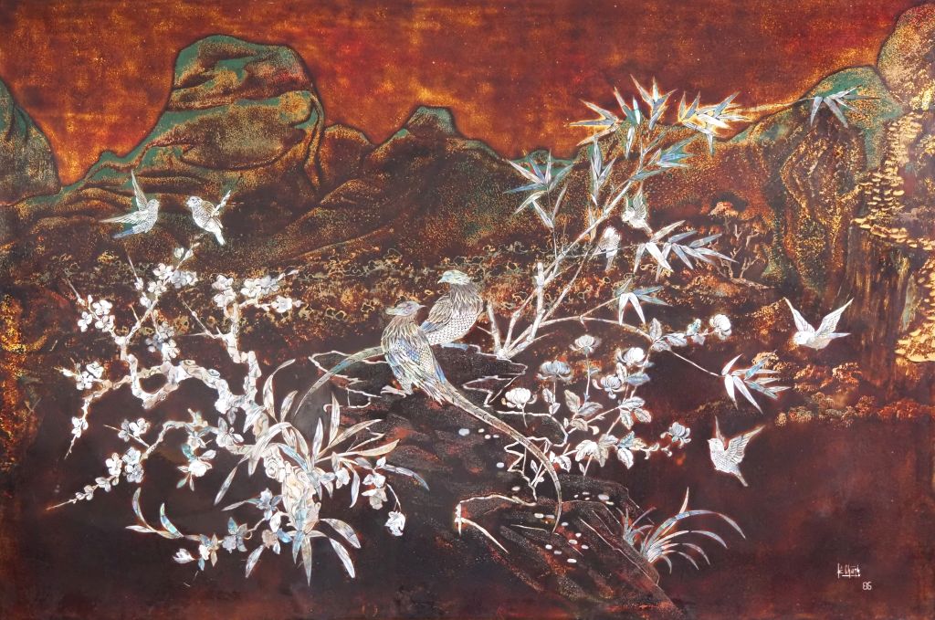 Vietnam, XXe siècle, Panneau en laque représentant des oiseaux sur des branches fleuries sur fond de paysage montagneux. Signé en bas à droite Chanh Lê 86. Dim. 81 x 122 cm