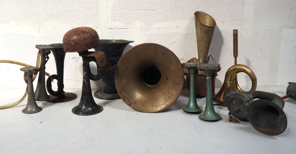 Lot de 9 différents klaxons pour automobile. au prix de 40 à 60 € en vente aux enchères par l'hôtel des ventes Primardeco