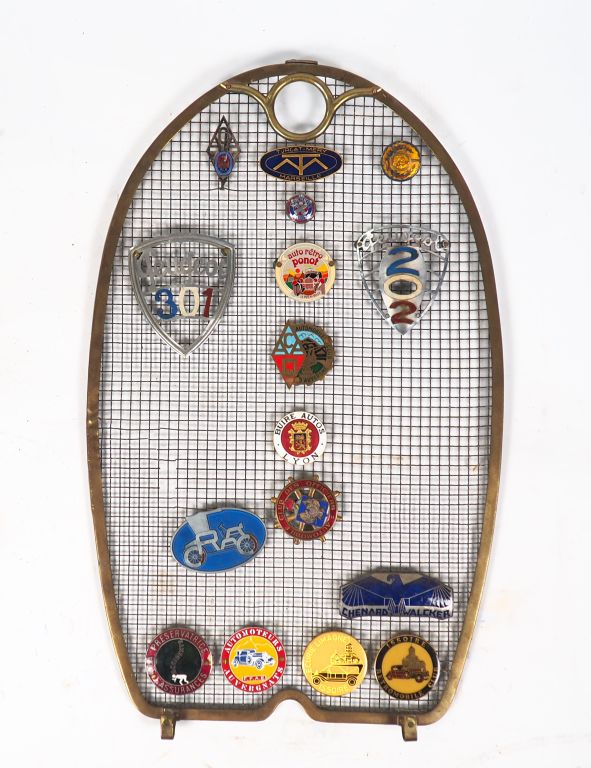 Lot de Calandre d'automobile ornée de seize différents macarons automobiles. au prix de 40 à 50 € en vente aux enchères par l'hôtel des ventes Primardeco