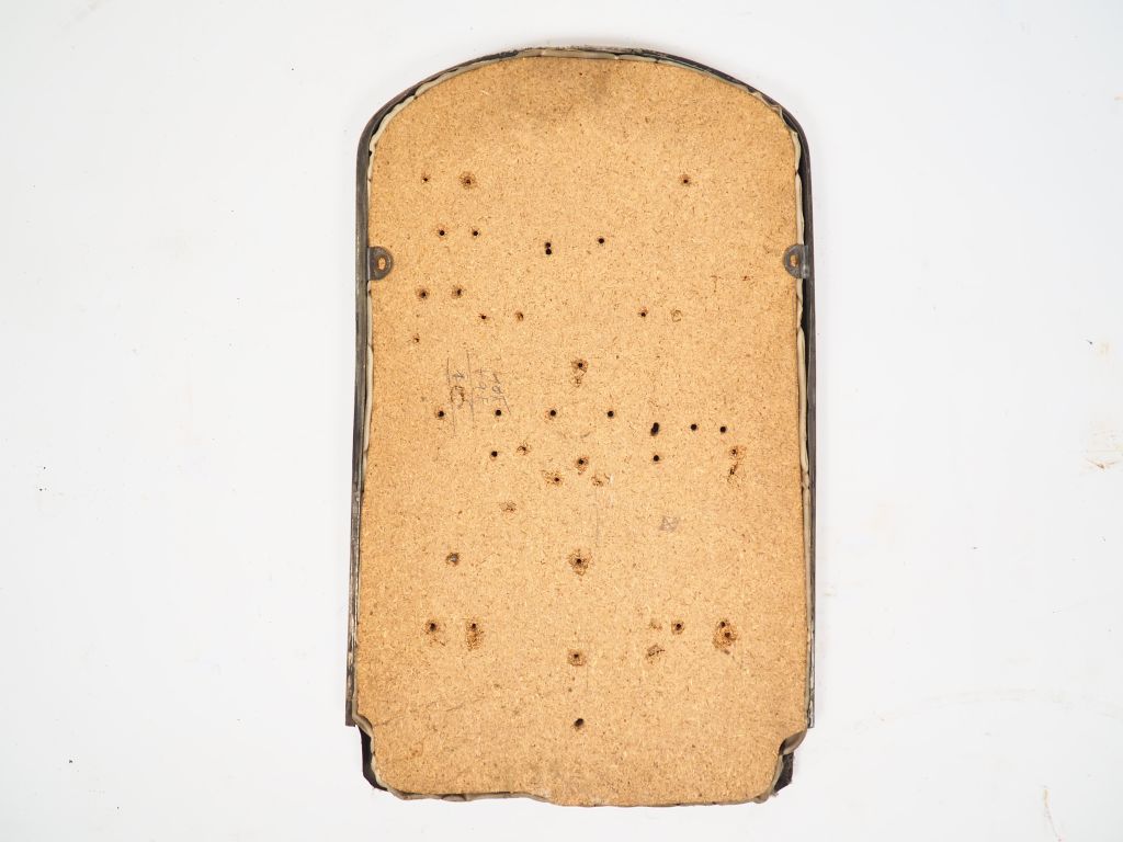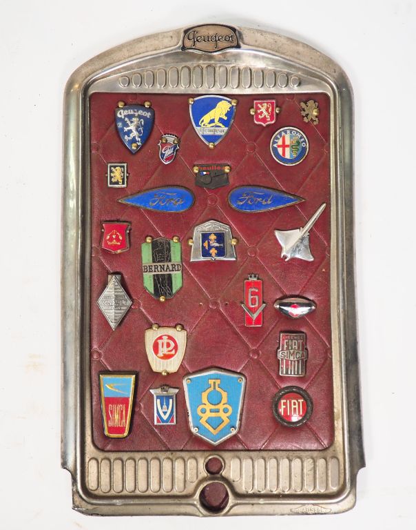 Calandre d'automobile Peugeot de marque CHAUSSON ornée de vingt-quatre différents macarons automobiles. Dim. 68 x 42 cm.