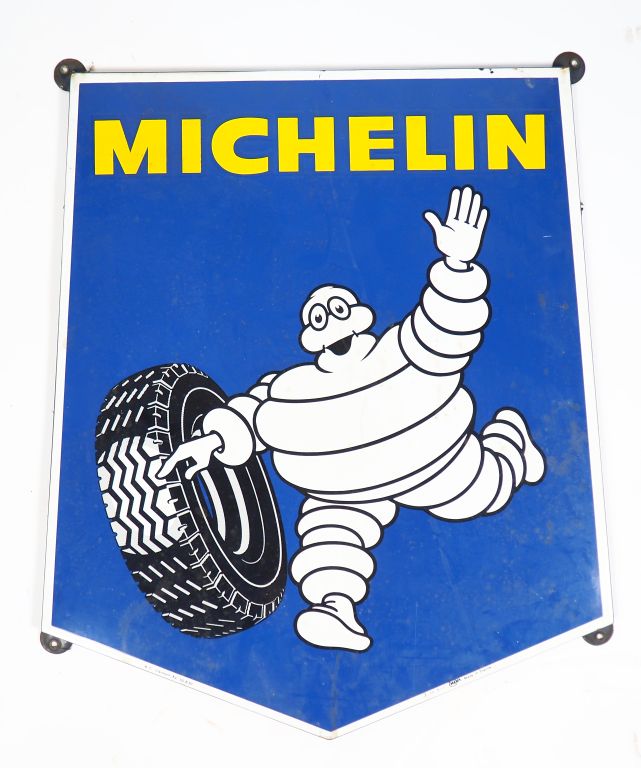 Lot de MICHELIN. "Bibendum au pneu". Grande plaque émaillée. Dim. 80 x 68 cm. au prix de 120 à 150 € en vente aux enchères par l'hôtel des ventes Primardeco