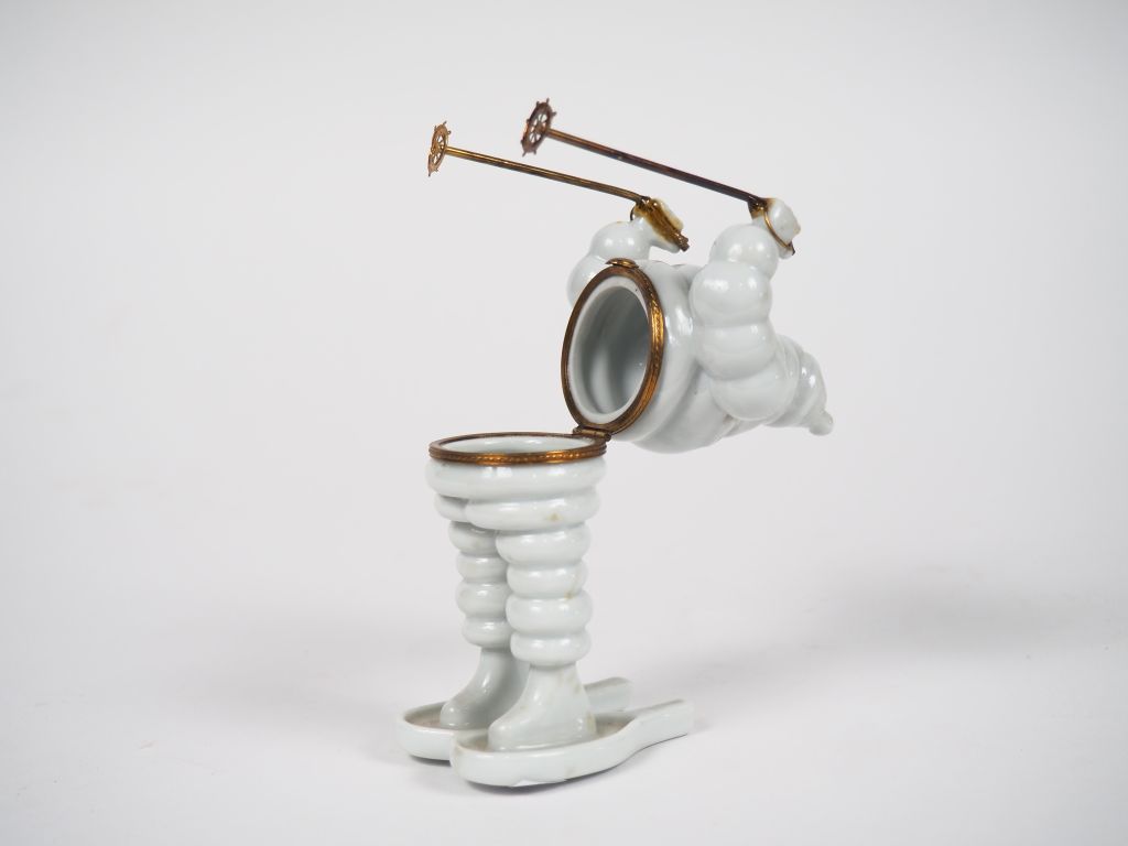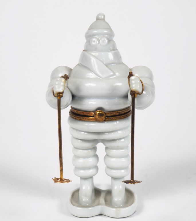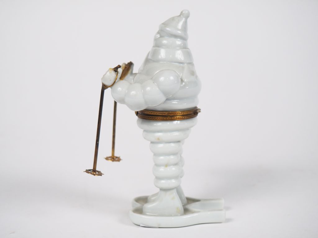 Lot de MICHELIN. Bibendum skieur, boîte en porcelaine de Limoges. H. 14 cm. au prix de 15 à 20 € en vente aux enchères par l'hôtel des ventes Primardeco