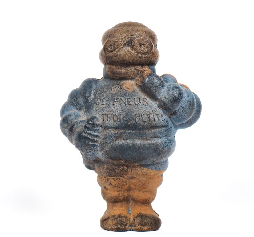 MICHELIN. Bibendum, sujet en caoutchouc bleu et brun circa 1950-1960 (état d'usage). H. 15,5 cm.
