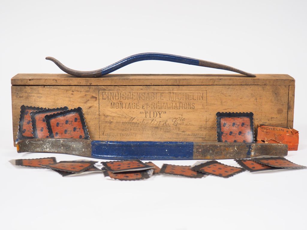 MICHELIN. Boite à outils 'TIDY' en bois contenant un lot de rustine et deux démontes pneus. Dim. 40 x 10 x 5 cm.