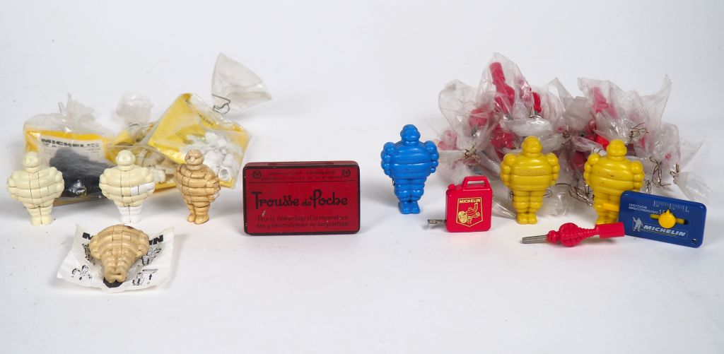 MICHELIN. Boite en tole lithographiée "trousse de poche". On y joint sept BIB-puzzles ( un incomplet), vingt clés de bibendums rouge (deux cassées) et cinq petits sujets formant mètre.