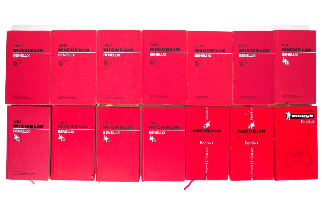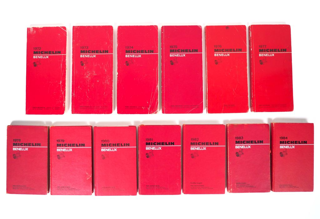 MICHELIN. Collection complète de guides Bénélux, édition française, de 1904 jusqu'à 2021 (90 guides). ( quatorze volumes en état d'usage et deux volumes avec traces d'écriture).