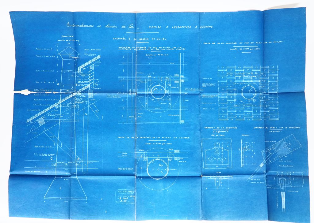 MICHELIN. Deux différents plans de remises à locomotives à Estaing (1921). (état d'usage).