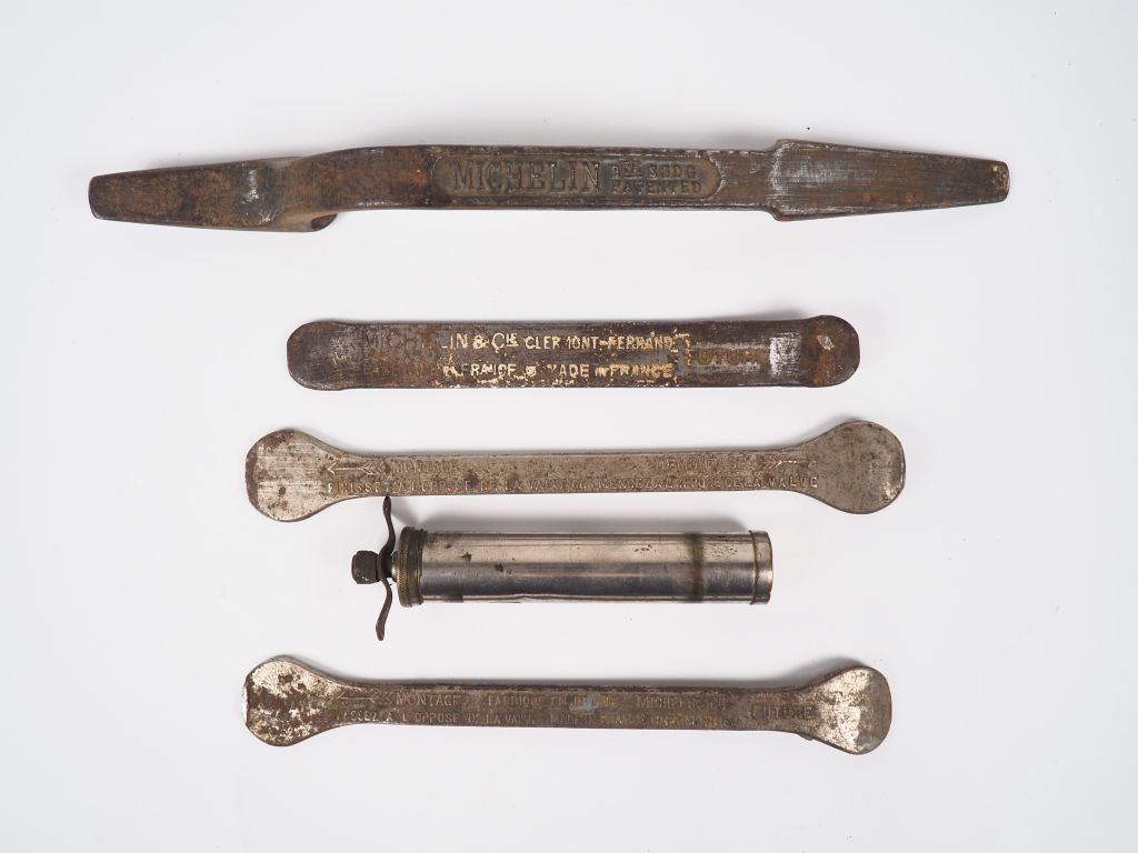 Lot de MICHELIN. Lot de 4 démontes pneus et une pompe de voyage. au prix de 20 à 30 € en vente aux enchères par l'hôtel des ventes Primardeco