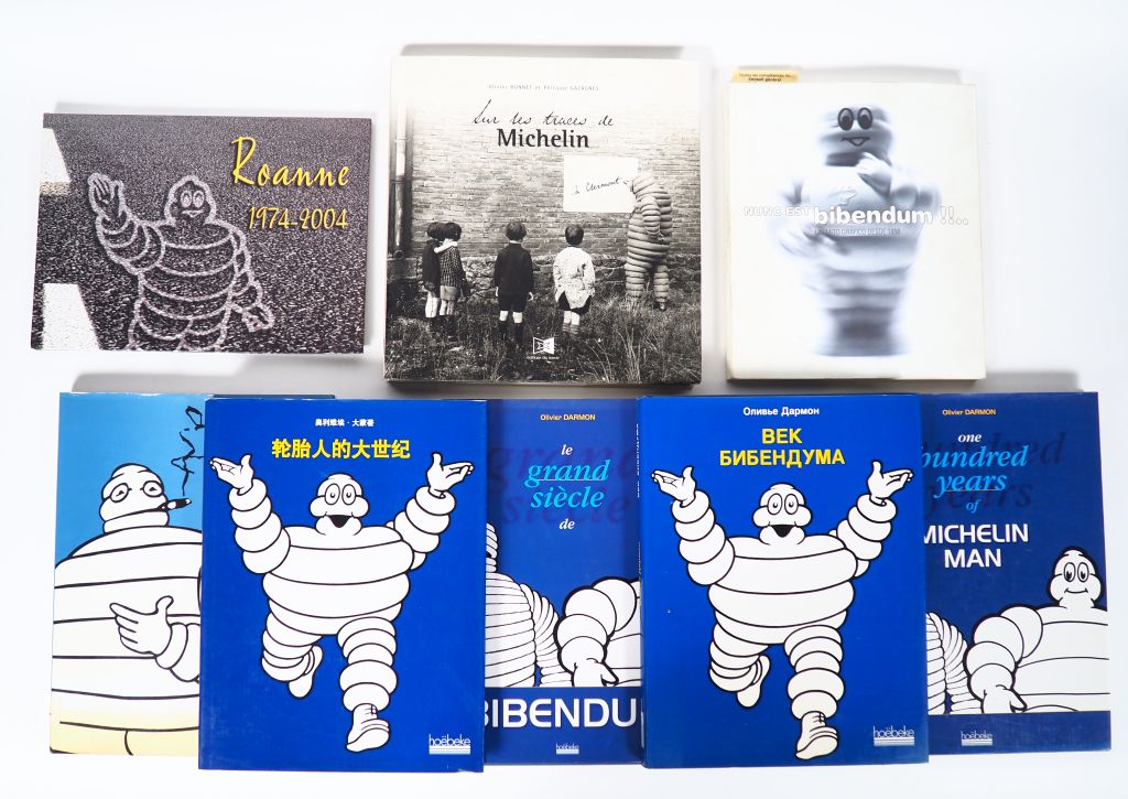 MICHELIN. Lot de huit livres : - Sur les traces de Michelin à Clermont - Le grand siècle de Bibendum ( x 2) - One hundred years of Michelin Man - Deux ouvrages en langue étrangère - Nuc est Bibendum