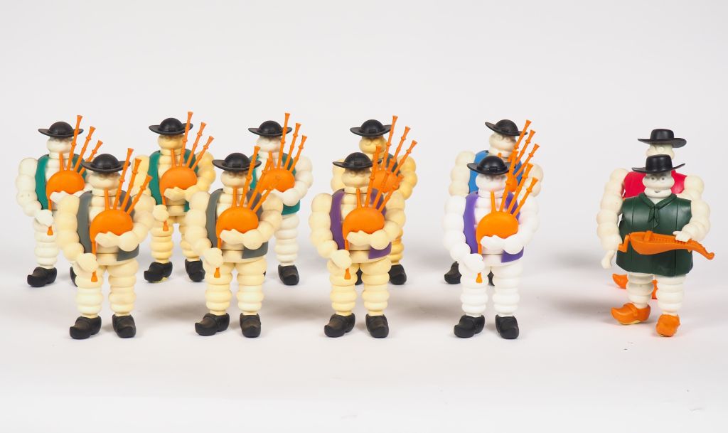 MICHELIN. Lot de onze figurines représentant des bibendums jouant de la vielle à roue (deux bidendums) et de la cornemuse (neuf bidendums).