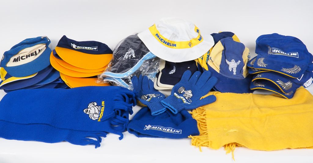 MICHELIN. Lot d'objets publicitaires comprenant : - 33 casquettes - 3 visières - Un bob - deux écharpes - une paire de gants - un bonnet