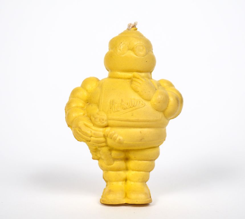MICHELIN. Petit Bibendum jaune, sujet en plastique souple circa 1960. H. 6 cm.