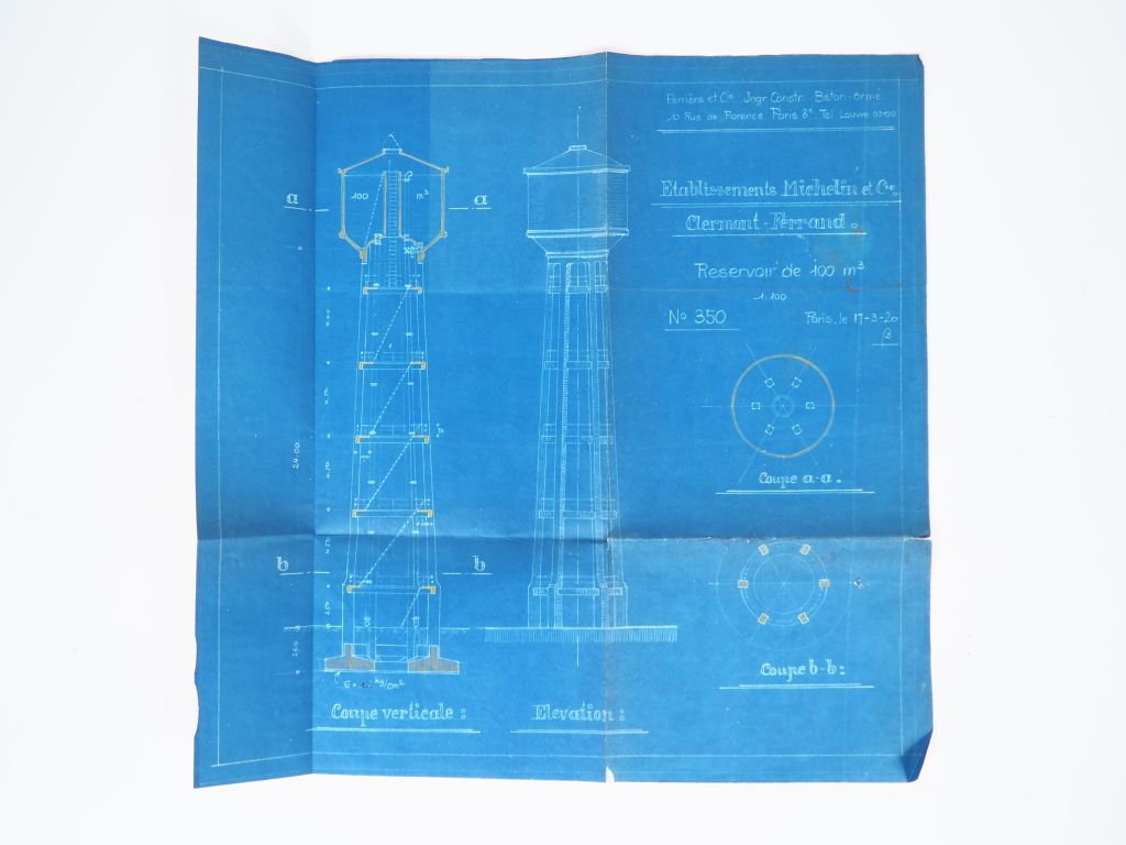 MICHELIN. Quatre différents plans : - deux plans de clôture datés du 10 et 23 novembre 1906 - Projet de chaufferie pour S.31daté du 7 octobre 1924 - Un réservoir de 100 m3 daté du 17 mars 1920 (état d'usage).