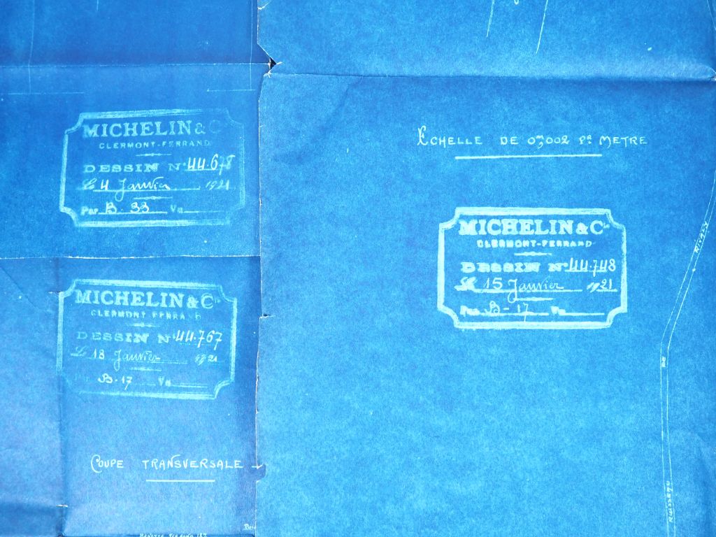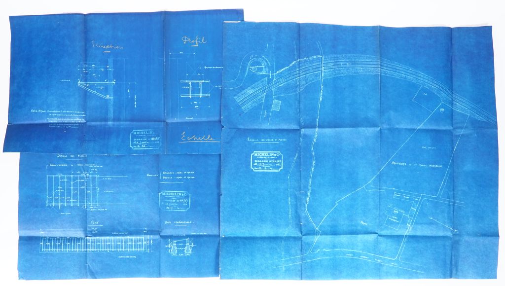 MICHELIN. Trois différents plans de la propriété de Monsieur Marcel Michelin à Layat : - Le chassis pour jardin potager daté du 18 janvier 1921 - Le plan d'ensemble du branchement d'eau daté du 15 janvier 1921 - Console support de la chasse d'eau daté du 4 janvier 1921. (état d'usage)