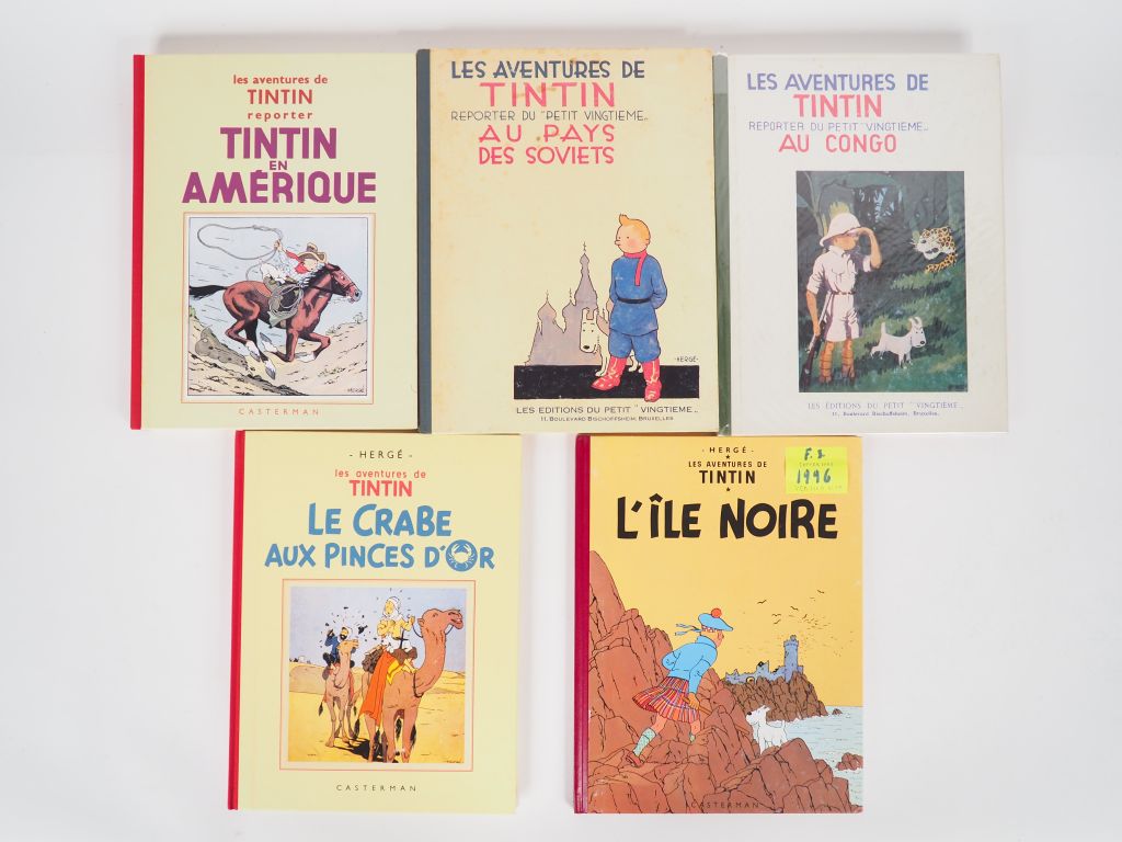 5 albums FS dont Tintin au Congo (1982) TBE + EN Amérique (1995) TBE +Ile Noire (version Tintin sur 2 lignes ed couleur 1996) NEUF + Le Crabe aux pinces d'or (1989) TTBE + Tintin aux pays des soviets (1981) album jauni par le temps.