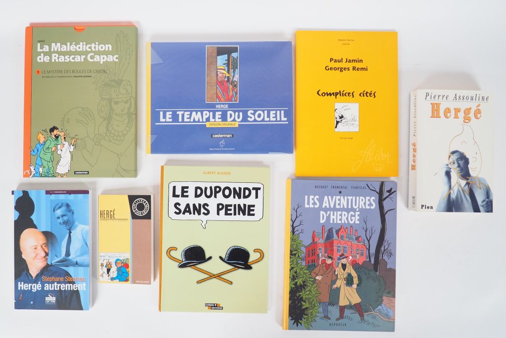 8 ouvrages sur Tintin (Hergé (1996),Hergé, Hergé Autrement (2003),Le temple du Soleil(1988),Le dupondt sans peine (1997) ,Les aventures d'Hergé (2007),Complices cités DEDICACE par Steeman + Numeroté (1998), La malédiction de Rascar Capac (2014)