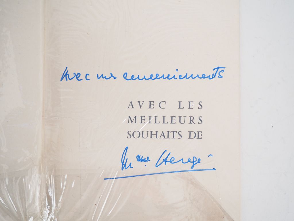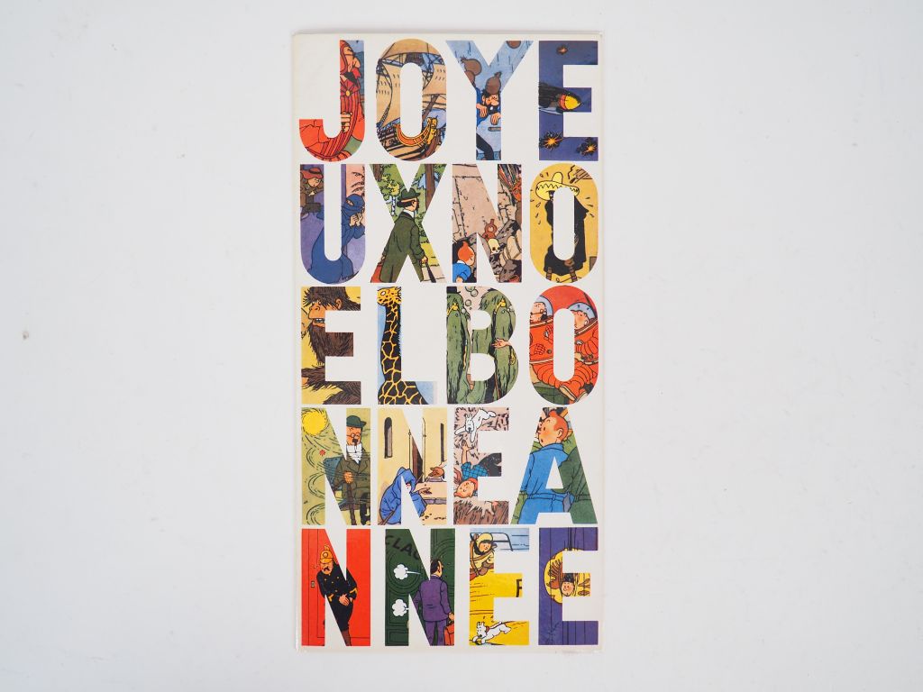 Carte de vœux 1965/1966 : Joyeux Noël, Bonne année découpés dans les aventures de Tintin. Signée par Mme Hergé ! Etat neuf.