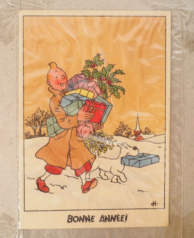 Carte neige N°23,"Tintin et Milou portant des cadeaux", Réed avec "Bonne Année" Imprimerie Casterman Tournai 1950 TTBE