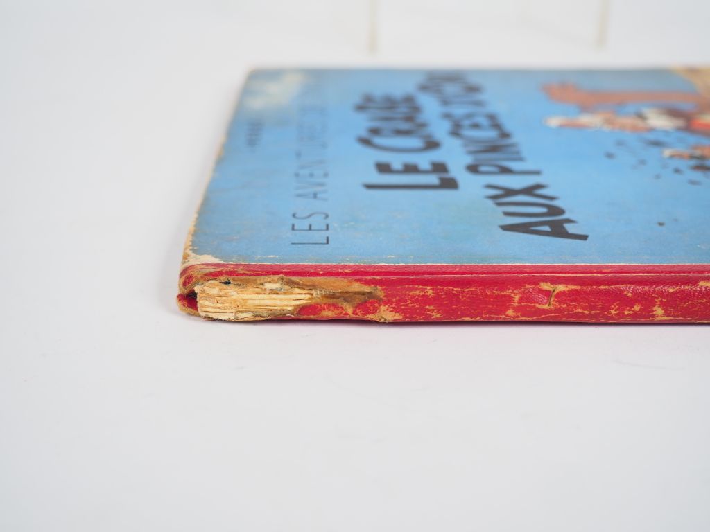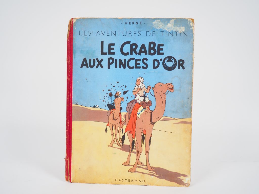 Le Crabe aux pinces d'Or - 1951 - DR B5 - Intérieur BE - Coins frottés et abimés - tranche abimée en bas sur 4 cm et manquante en haut sur 3 cm 1er Couv frotté et marque de trace blanche. Page de garde avec trace blanche - Album en BE-.
