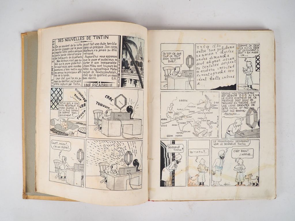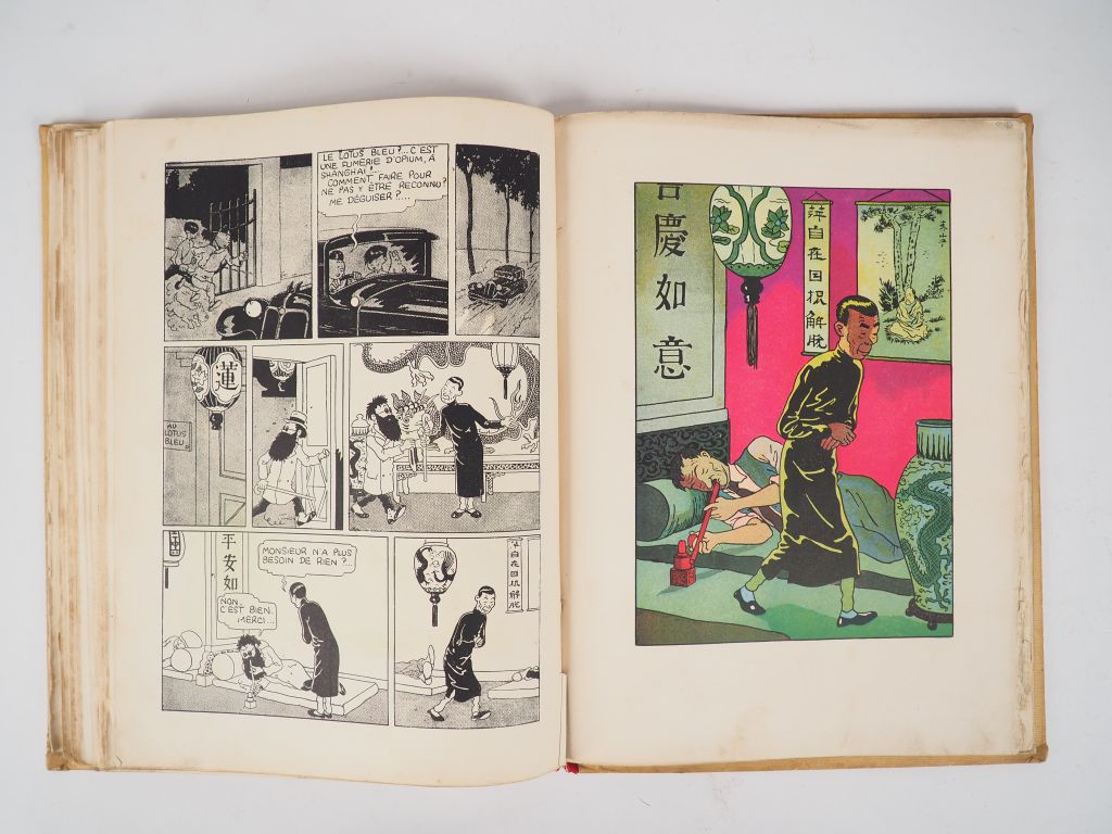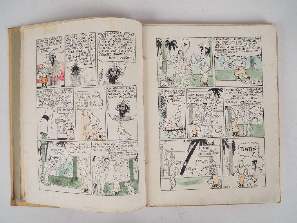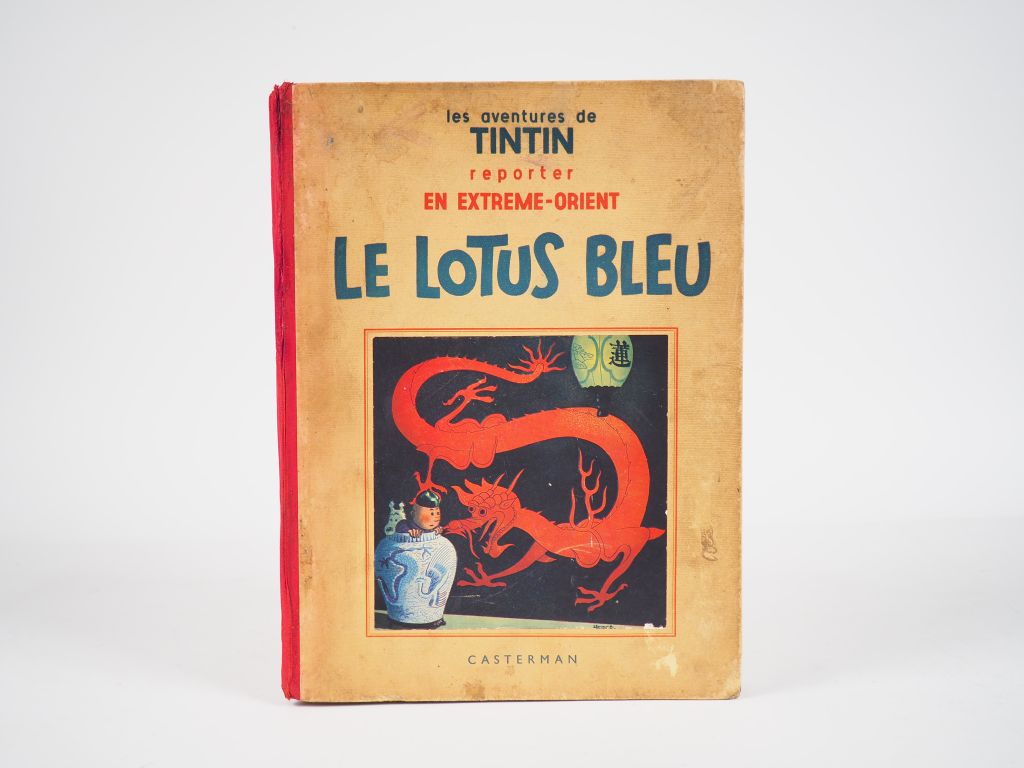Les Aventures de Tintin reporter en Extrême Orient - LE LOTUS BLEU - 1936 EO avec les 5 HT couleur.Petite image collée - Pages de garde grises. 4e plat blanc et neutre- Exemplaire en BE+ quelques cases coloriées au crayon- Trois pages avec scotchs sur cases.