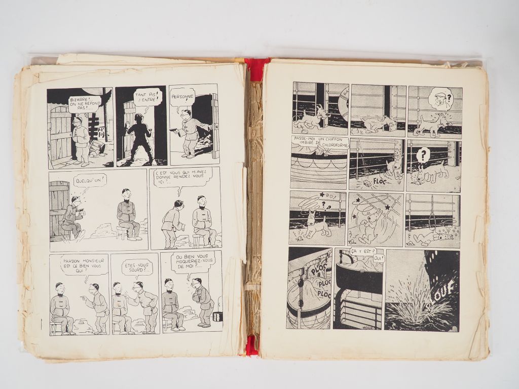 Les Aventures de Tintin reporter en Extrême Orient - LE LOTUS BLEU - 1936 EO sans les HT.Petite image collée - Pages de garde grises.4e plat blanc et neutre- Exemplaire à remettre en état- Pages décollées du cahier, manque la 2e page grise et 3 pages. Etat à restaurer Moyen