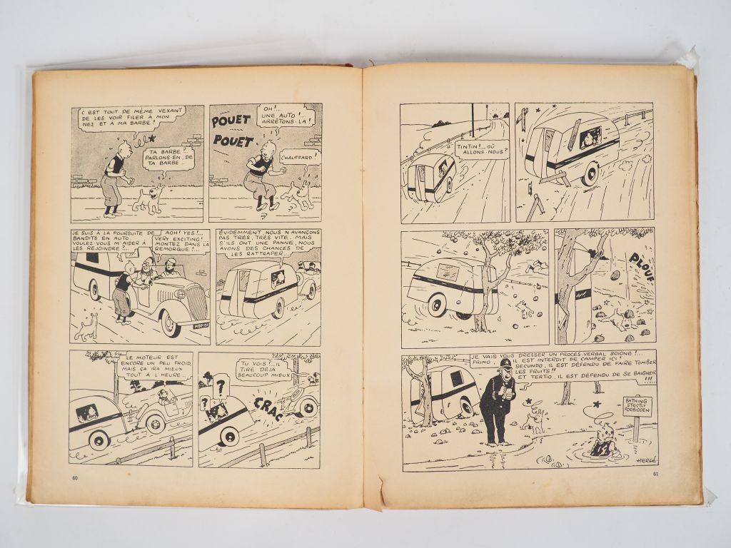 Les Aventures de Tintin reporter - L'île Noire-1938 NB - 4e plat A5 - 4HT coul. - Pages de garde bleues foncées - Petite Image collée - 127 p La signature d'Hergé apparait au 1er plat (seul album à mentionner Hergé et reporter au 1er plat) BE 1er plat avec quelques frottements et usures du temps,tête de milou sur image abimée, interieur parfait avec quelques rousseurs 4e plat quelques petites tâches.