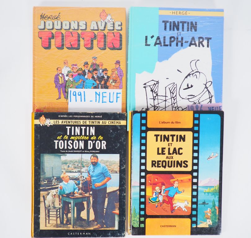 LOT de 4 albums : Tintin et le mystère de la Toison d'or (B32 BE+), Album jeu "Jouons avec Tintin" 1991 TBE Tintin et l'Alph art 1986 TBE, Tintin et le lac aux requins EO BE