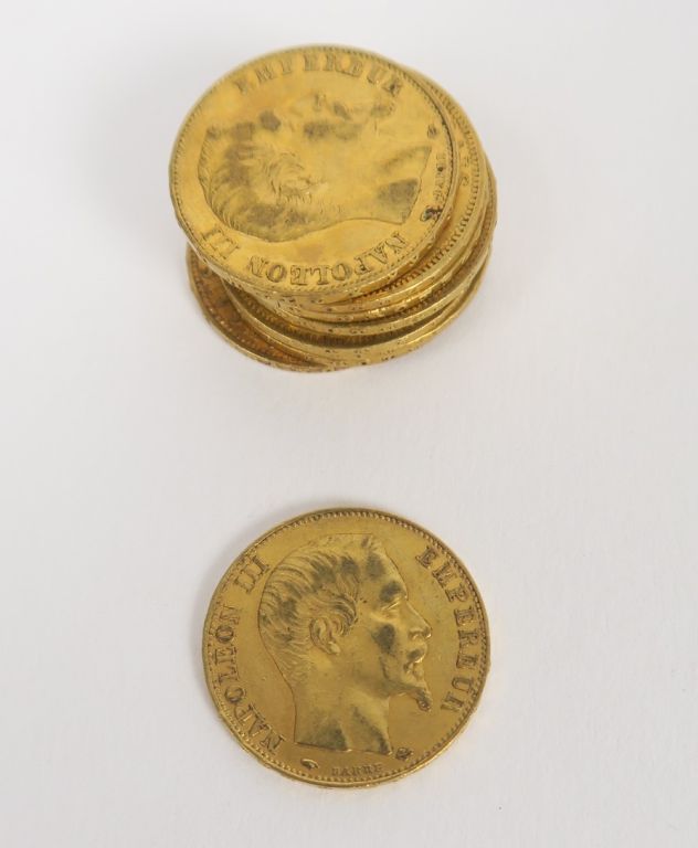 10 pièces de 20 francs or (1853, 1854, 1855, 1856 x 2, 1857 x 2, 1858 B, 1859 B, 1859). Frais acheteur 20 % TTC