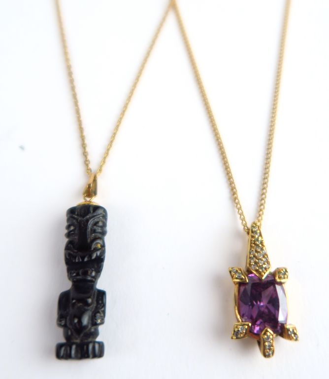 2 chaines en or (6,7 g) et 2 pendentifs fantaisie orné d'une pierre violette pour l'un et d'un totem en bois pour l'autre