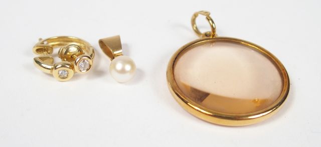 2 pendentifs monture or, perle et loupe. On y joint 2 perce-oreilles en or jaune et diamants taille moderne de 0,06ct et 0,08ct environ. Poids tel: 9,6gr