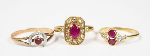 3 bagues en or jaune, ornées de diamants et de rubis (une accidentée). Poids tel: 5,6gr