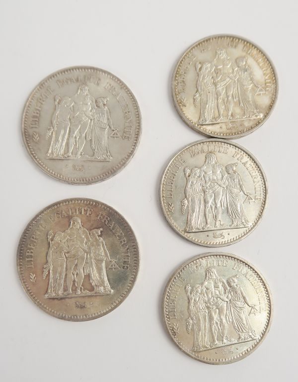 5 pièces argent : 2 pièces 50 francs, 3 pièces de 10 francs