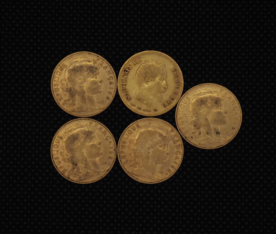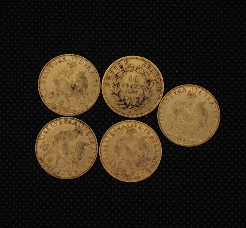 5 pièces de 10 Francs or : 1855, 1901, 1908, 1906, 1905