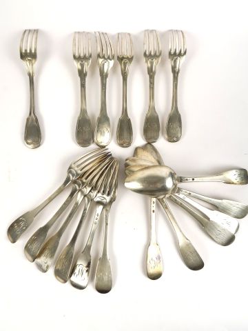 6 fourchettes en argent, poinçon au coq, modèle uniplat, chiffrées. On y joint 6 cuillères assorties en argent, poinçon au coq, et 5 fourchettes en argent, poinçon Vieillard, modèle à filet (+une fourchette en métal argenté). Poids : 1 524 g