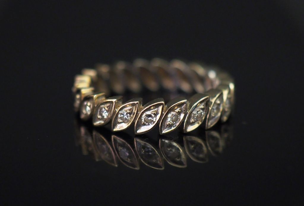Alliance américaine en or blanc, ornée de petits diamants sertis clos dans une forme navette. TDD. 54 Poids tel. 4,54 g