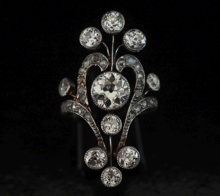 Bague 1900 de forme stylisée et ajourée, ornée en son centre d'un diamant taille ancienne serti clos pesant 1,1 ct environ, agrémentée de petits diamants taille ancienne sertis clos et d'un pavage de petits diamants taillés en rose. TDD. 59 Poids tel. 8,39 g