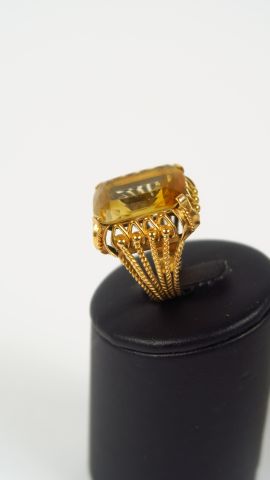 Bague 1900 en or jaune, belle monture ajourée ornée d'une citrine. 11 g