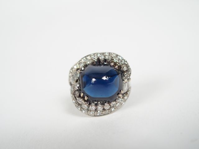 Bague 1920-1930 monture travaillée or blanc, ornée en son centre d’un saphir taille cabochon (traitements) entouré de diamants taille moderne ou baguettes. TDD 51 Poids tel : 6,2gr