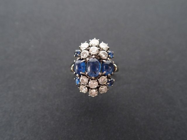 Bague 1940 monture or blanc ornée de 3 saphirs taille cabochon disposés en chute, épaulés de 12 diamants taille ancienne de 0,12cts environ et rehaussés de 4 petits saphirs cabochon. TDD 54 Poids tel: 6gr