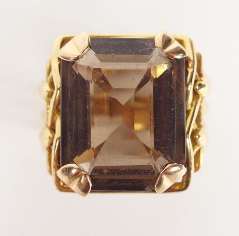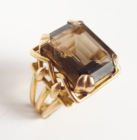 Bague 1950 en or jaune, ornée d'un quartz fumé taille rectangulaire de 10ct environ, monture ajourée à décor de motifs Art Déco. TDD 57 Poids tel: 10,2gr