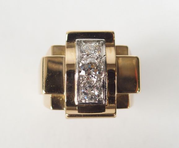 Bague 1950 monture or jaune ornée de 3 diamants taille ancienne de 0,40ct environ et 2 de 0,20ct environ. TDD 57 Poids tel : 15,2gr