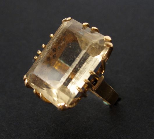 Bague 1960 monture or jaune, ornée d'une citrine taille rectangulaire de 24 cts environ. TDD 56 Poids tel: 14,1gr