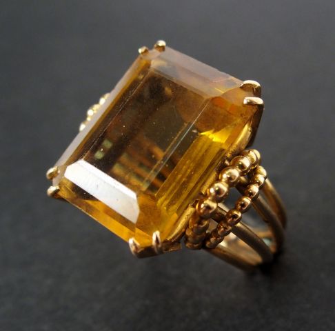 Bague 1960 monture or jaune travaillée, ornée d'une citrine taille rectangulaire de 17cts environ. TDD 49 Poids tel: 13,7gr