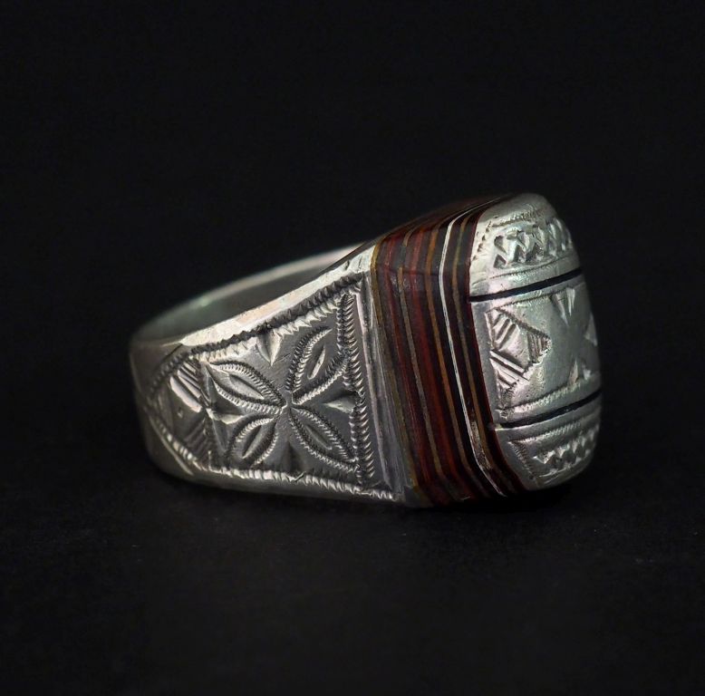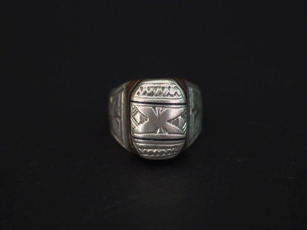 Bague Afrique du Nord en argent rehaussé d'émail, à décor de motifs géométriques. TDD. 63 Poids tel. 17 g